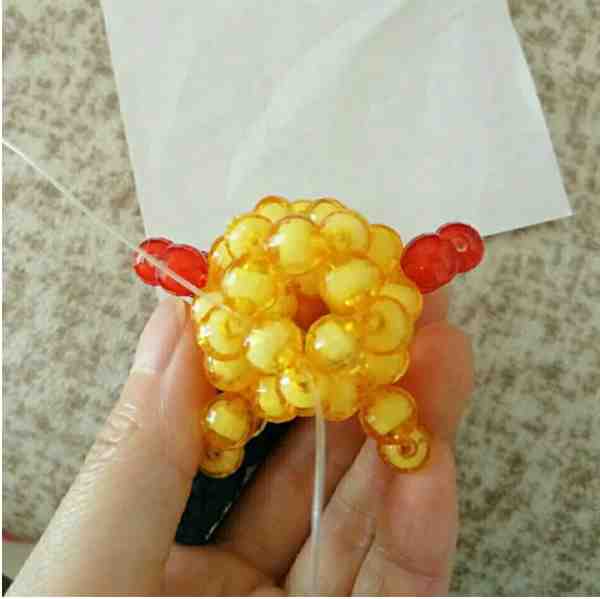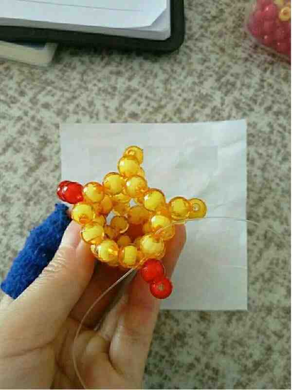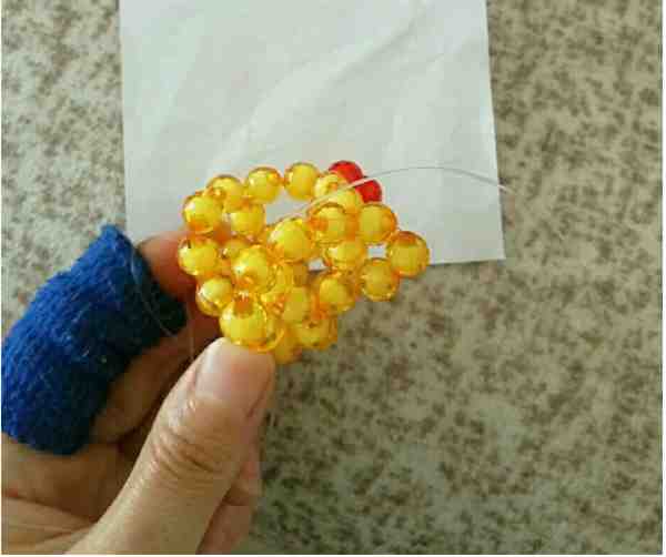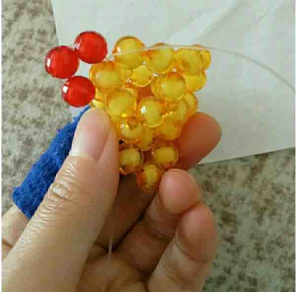 3、左线过三颗珠子左线加三颗红色珠子从下往上穿刚过的第三颗珠子,右线加两颗黄色珠子回扣。