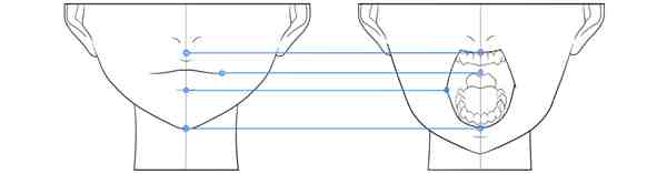 确定嘴巴垂直张开极限的另一种方法是测量鼻子的长度,因为两者的大小相同。在水平方向上,嘴唇的边界经过,并且从两个角度来看都与眼睛的中间处于同一水平。