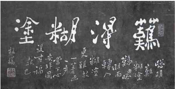 该作品是其真实心境的写照,亦是其一生为人的准则。他以楷书、隶书为基础,同时揉入篆书、行草书的笔意,既有隶书的宽扁之形,又有楷书的端正之态,更有行草的流畅之神。整个作品古拙道劲、风骨超然、气势雄壮,又洋溢着和谐的节奏与韵律,如行云流水般洒脱自如,字里行间流露出其独特的艺术风格和审美价值。