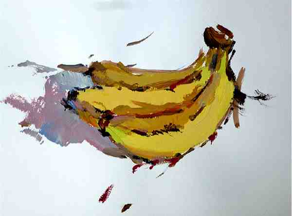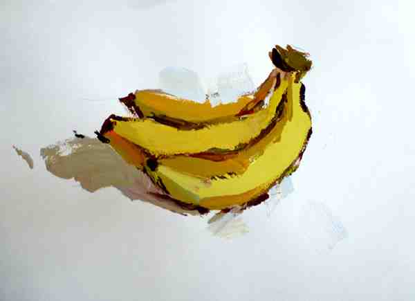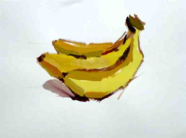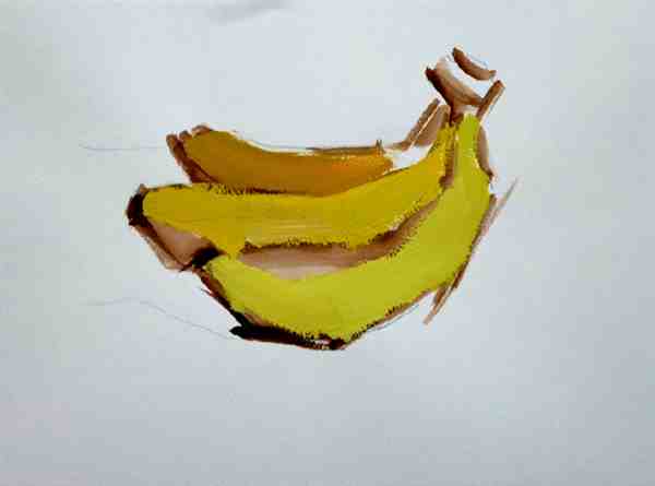 5、进一步丰富香蕉的形色关系,加强香蕉体积感和空间感的表现。最后用小号笔点出香蕉的褐色疤痕,使画面更加生动,完整。