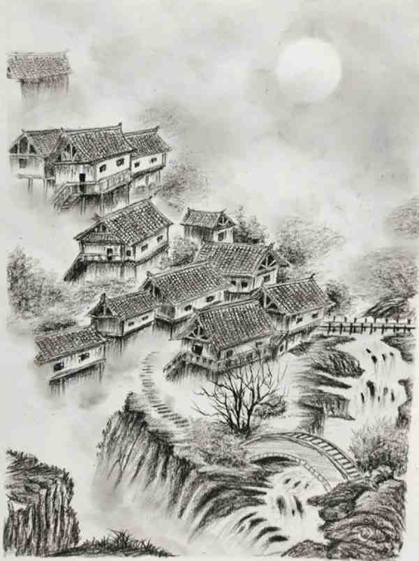 在铅笔的描绘下,古村落显得格外宁静祥和。青瓦白墙的房屋错落有致,炊烟袅袅升起,与周围的自然景观融为一体。这里的人们生活简朴,与大自然和谐共生。他们传承着千年的农耕文化,守护着这片土地的根与魂。