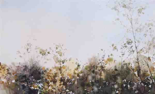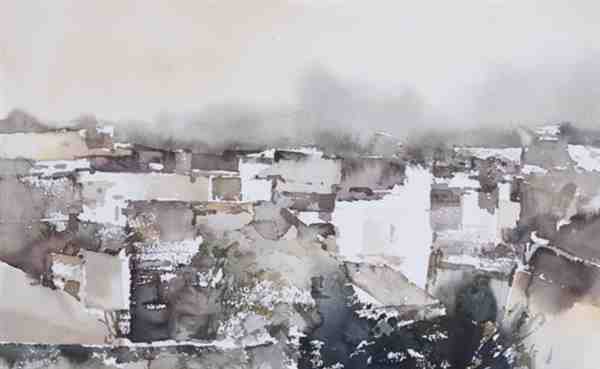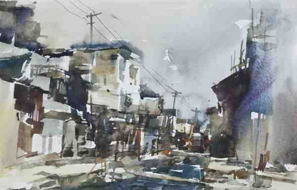 画家主观地把握物像,研究物质的根本,直击精神本质,因此在形式和技法的探索中更加有章有法。画面给人的感觉既不造作,又不漂泊;既不流于僵板,不失灵动变化,又稳定庄重,有细节有概括。少了形式上的模仿,多了内在精神的挖掘。构图上以物象的累积交错,彰显时空的沉淀,为怀旧与反思创造了广阔的空间。技法上以大写意的泼洒与精微的干叠相结合,干湿互动,相映成辉,既有笔的入微刻画,又有水的灵动幻化,体现了中西方水彩画技法上的契合。用色亮丽而强烈,丰富而含蓄,更注重统一,体现了东方美学的大和思想。