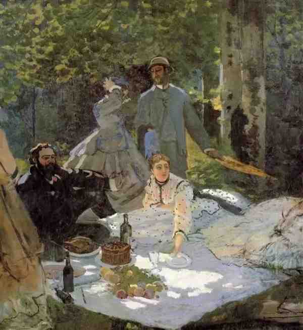 回溯到1865年,年轻的莫奈在舍依创作了一幅长20尺的巨作《草地上的午餐》。当时的他年仅25岁,充满了创作的激情与活力。而库尔贝,这位同样在舍依作画的艺术家,对莫奈的作品给予了极高的评价,并经常前来参观指导。然而,尽管库尔贝的建议让莫奈受益匪浅,但他最终并没有将这幅作品送去参加沙龙展览。因为他并不满意自己的创作,甚至在离开画室时,因交不起房租而将正稿抵押给了房东。遗憾的是,房东并没有妥善保管好这幅珍贵的作品,导致它受潮损毁。幸运的是,这幅草稿得以留存下来,成为了我们今天能够欣赏到的珍贵艺术品。