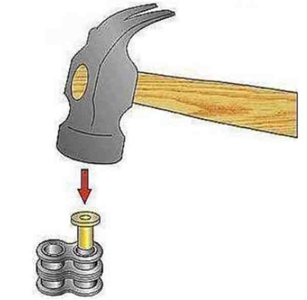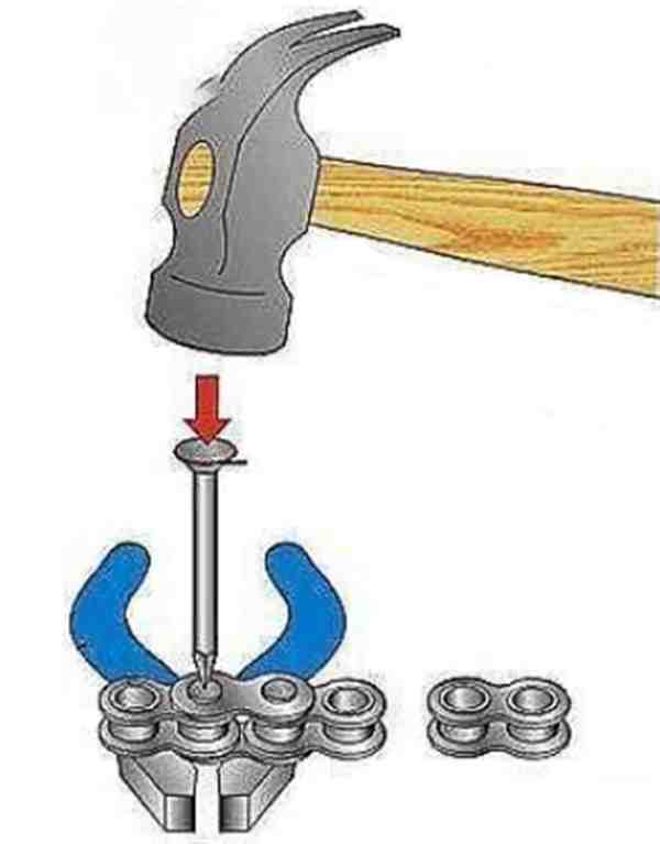 1、链条处理使用榔头和钢钉,将自行车链条的链轴敲出,选取8至10节链条备用。