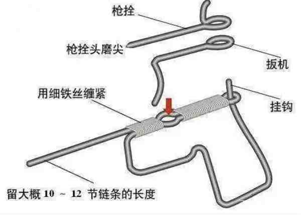 3、枪体制作利用粗铁丝,按照预定设计,制作出枪身、枪栓和扳机。