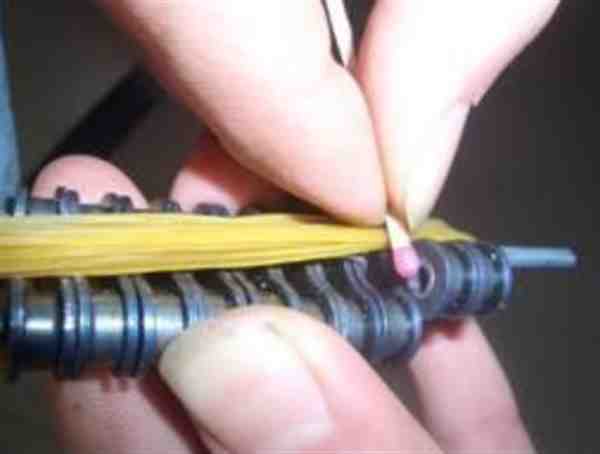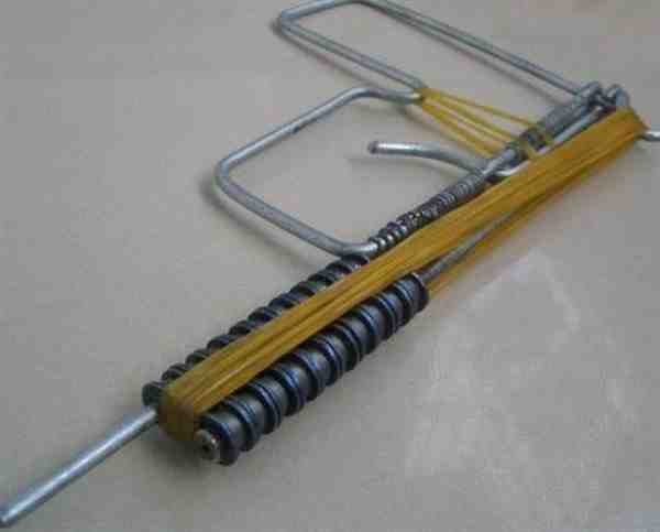 所需材料:自行车链条8至10节、自行车辐条螺帽1枚、橡皮筋若干、粗铁丝适量(需比自行车链条孔稍细)、锉刀、榔头、钳子、钢钉