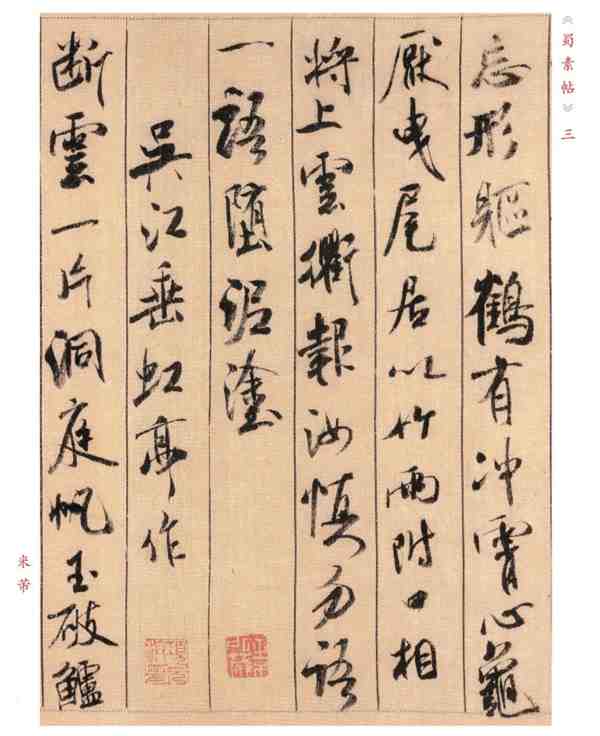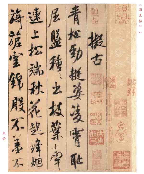 米芾《蜀素帖》共556字,抄录在织出的乌丝栏上共有五七言自作诗8首。全卷纵27.8厘米,横270.8厘米,凡71行。现藏台北故宫博物院。