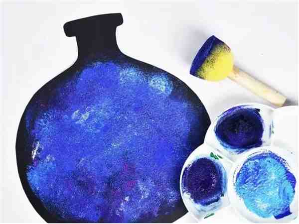 Step 3.准备深蓝色、蓝紫色的水粉颜料,用海绵拍蘸取颜料在瓶子里拍打出背景色块。