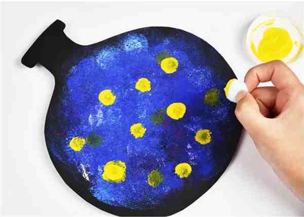 Step 4.用小的海绵印章或毛绒球,蘸取黄色颜料印出大大小小的黄色光点。