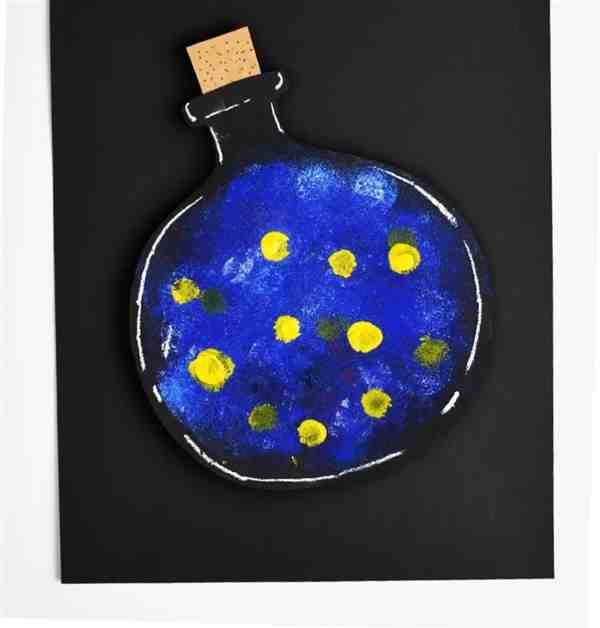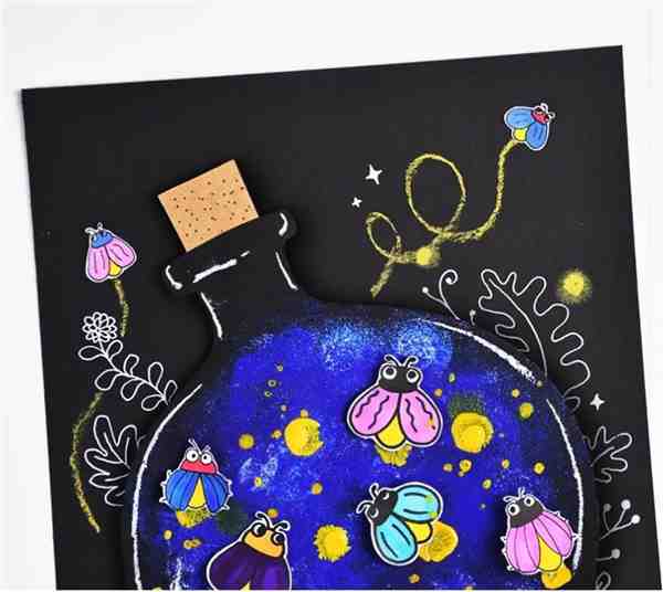 Step 7.将萤火虫粘贴在瓶子里,并用白色油画棒围绕瓶子,边框画出线条体现透明感质感。