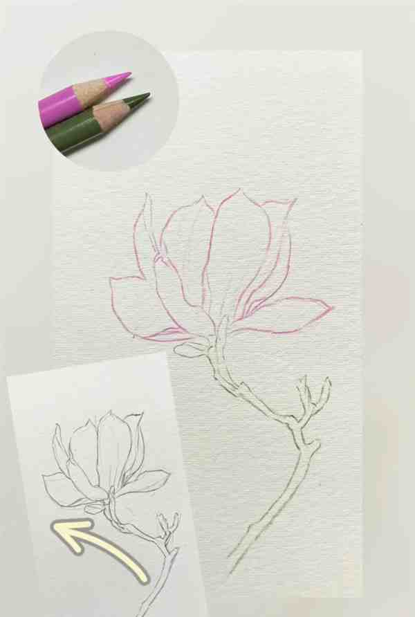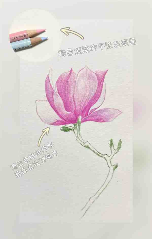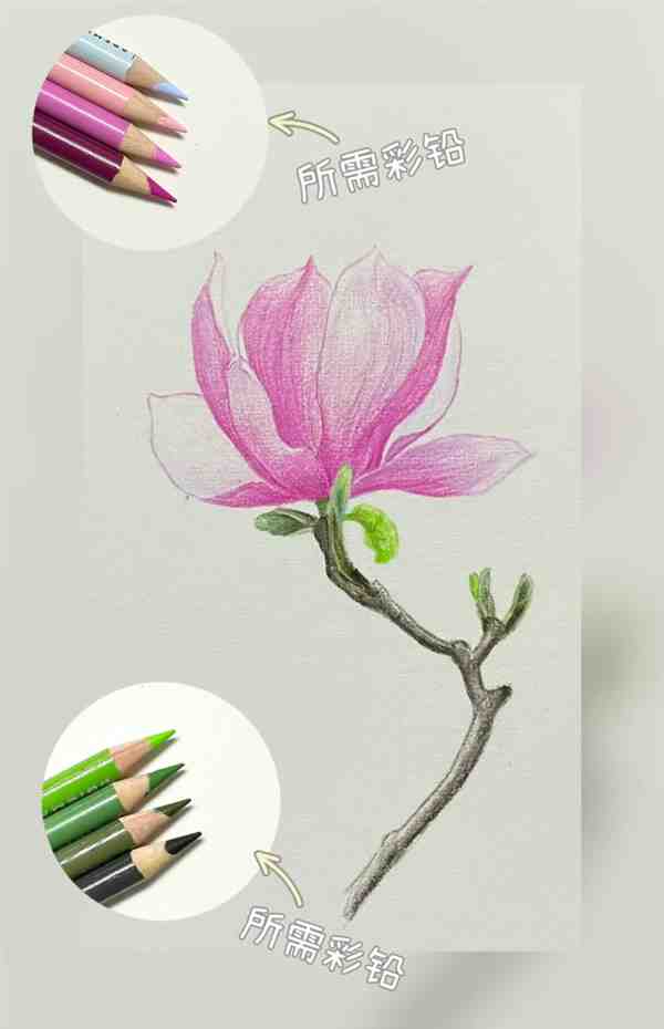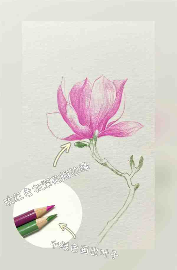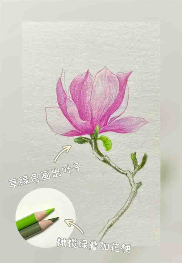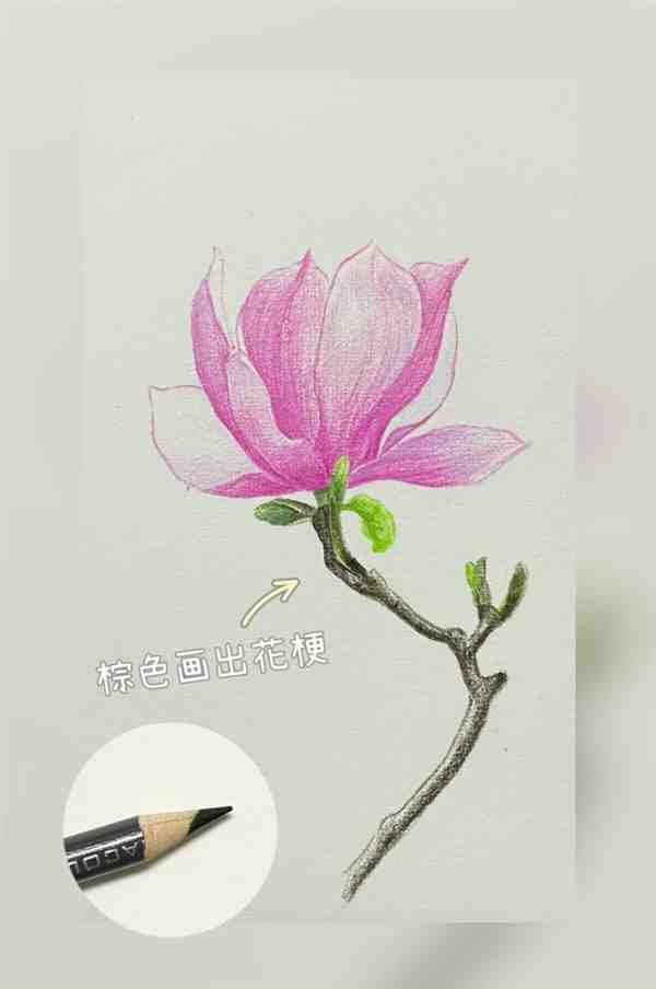 Step 7.棕色画出花梗,玉兰花彩铅画完成啦。