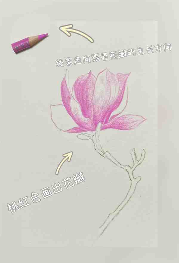 Step 3.线条走向跟着花瓣的生长方向,桃红色画出花瓣。