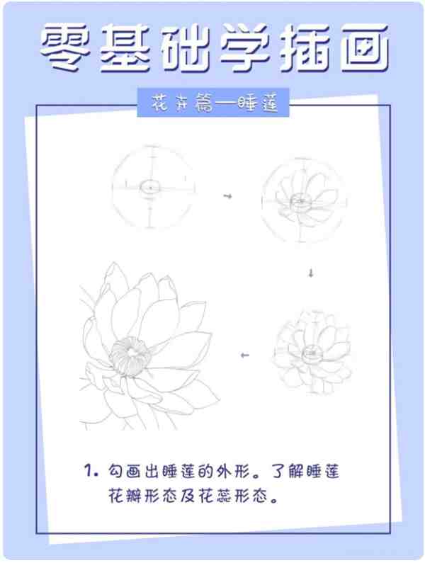 Step 1.勾画出睡莲的外形。了解睡莲花瓣形态及花蕊形态。