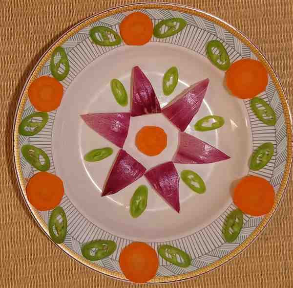 而且,我发现了一个小秘密。那就是不同的蔬菜切片搭配在一起,会产生不同的颜色和效果。比如红椒和黄椒搭配在一起,就会变成橙色;紫甘蓝和蓝莓搭配在一起,就会变成蓝色。这些颜色都是大自然的馈赠,让人感到无比的惊喜和感动。