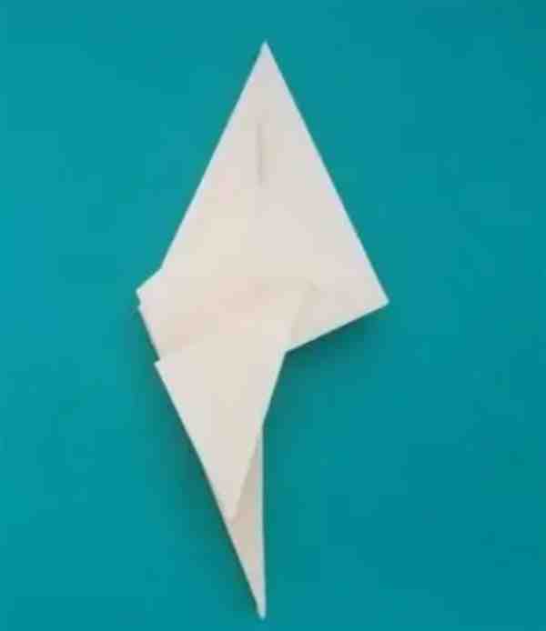 上步骤折叠的三角形,折向折纸的下面,使得上下2个边重合在一起,如图