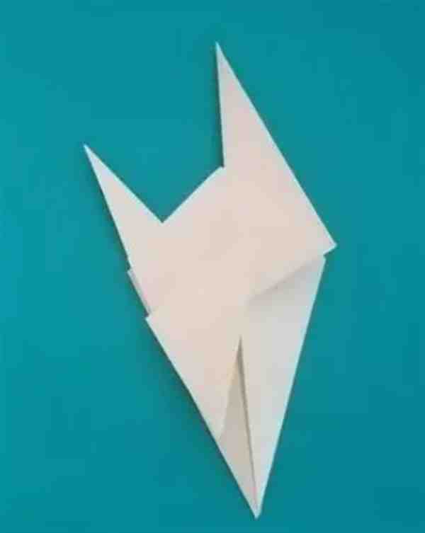 把折纸沿着中间的缝隙对折,折出一个鲨鱼的大体轮廓来,如图