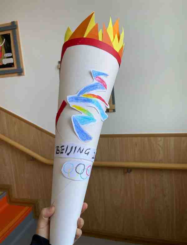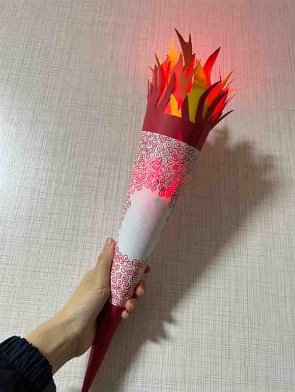 这是一套火炬手工,完成手工后,可以和孩子在家一起玩传递奥运圣火的游戏。