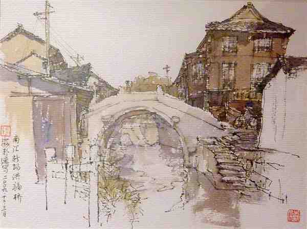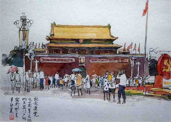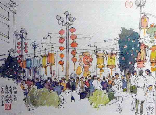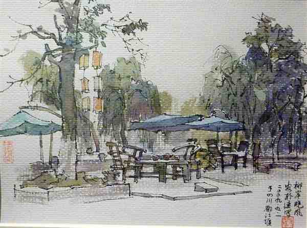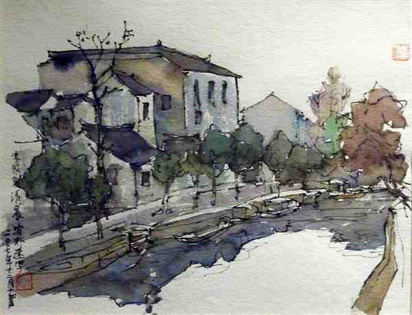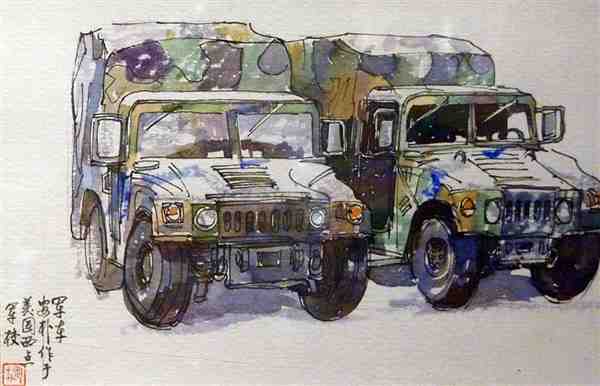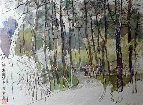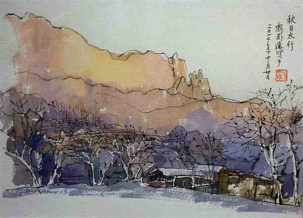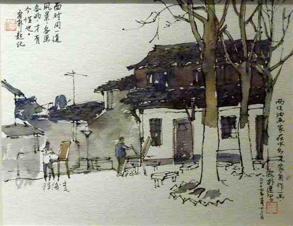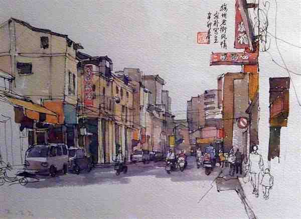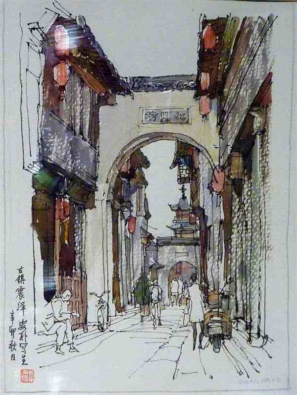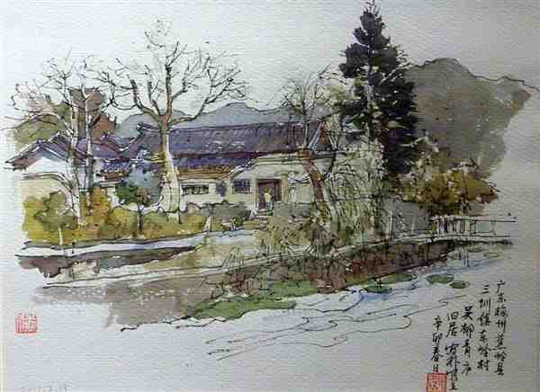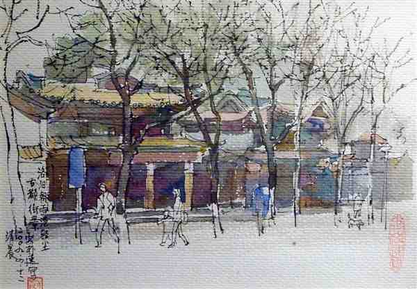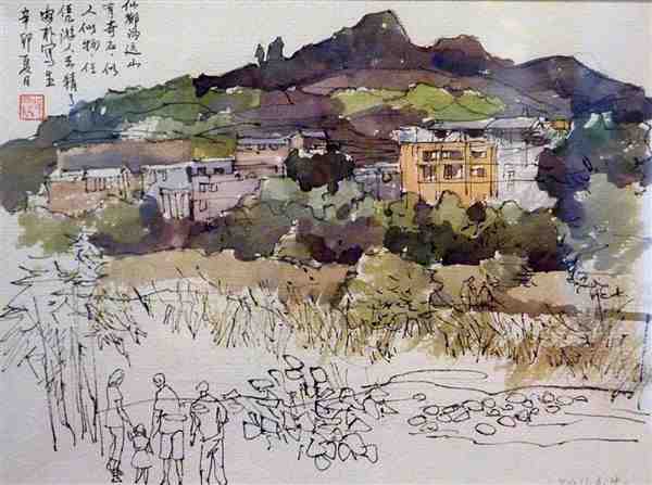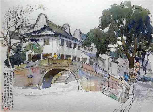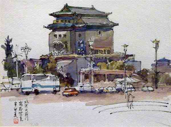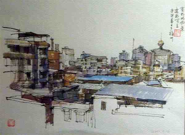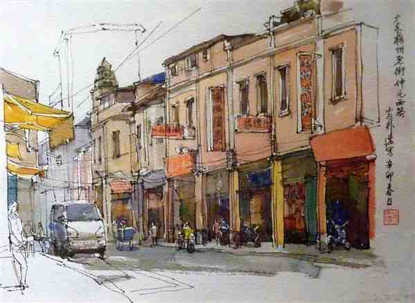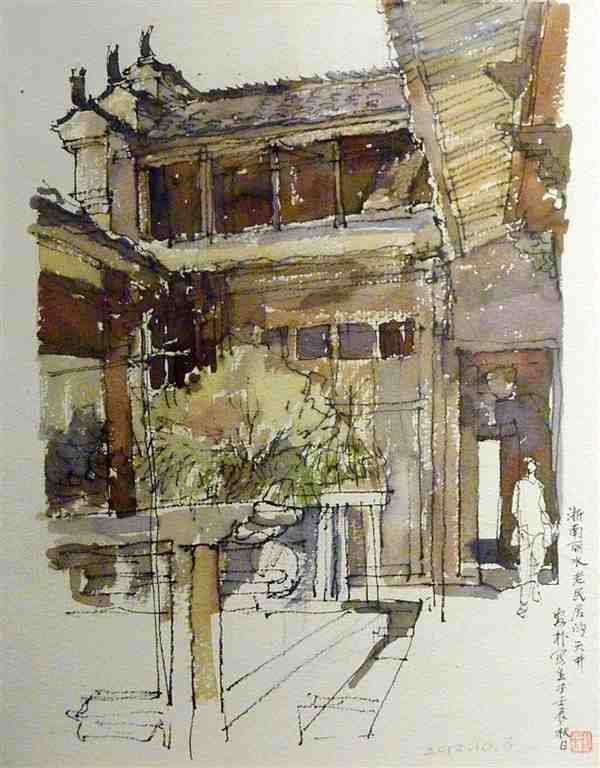 美术家用钢笔手绘水彩风景图片