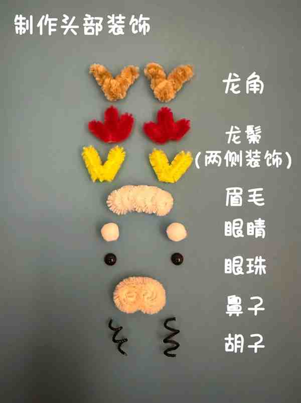 制作头部装饰:龙角、龙鬃(两侧装饰)、眉毛、眼睛、眼珠、鼻子、胡子。