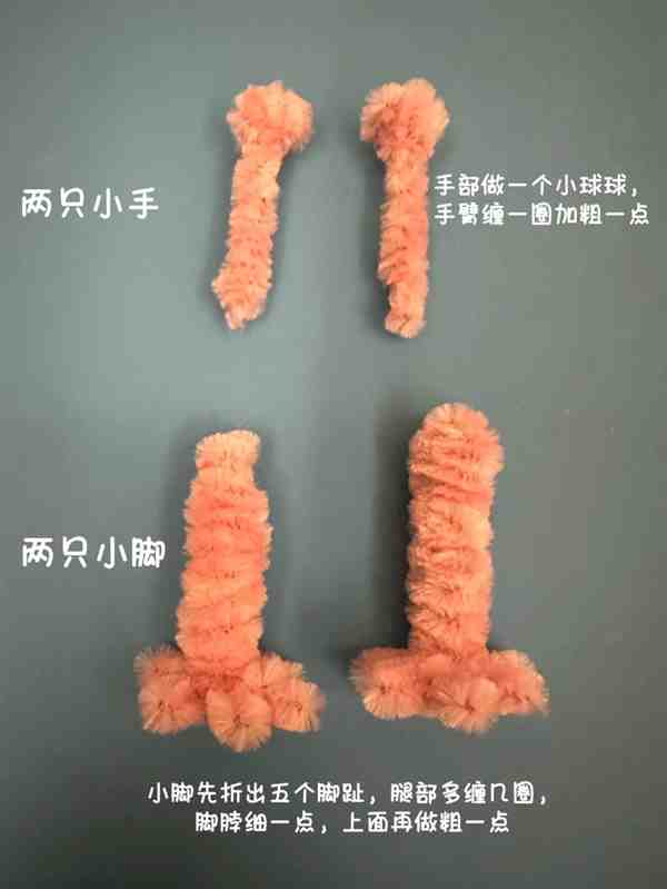 Step 12.两只小脚.小脚先折出五个脚趾,腿部多缠几圈,脚脖细一点,上面再做粗一点。