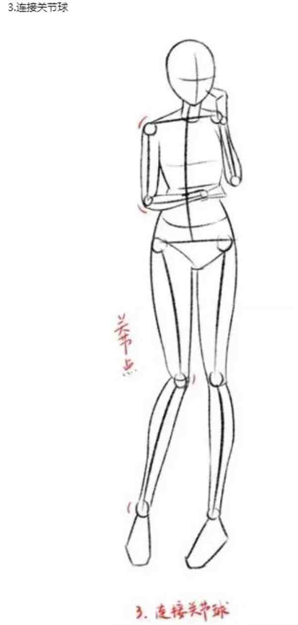 注意连接关节球,如果肢体轮廓画不好的小伙伴可以参考如图画法,画到这一步已经能看出一点点妖娆的身姿啦