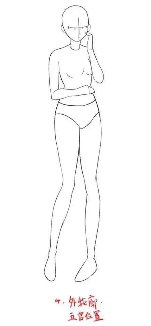 先画出头部轮廓,再画出十字线确定面部的朝向。用画出的头部测量出七个头的长度,这就是传说中的七头身。