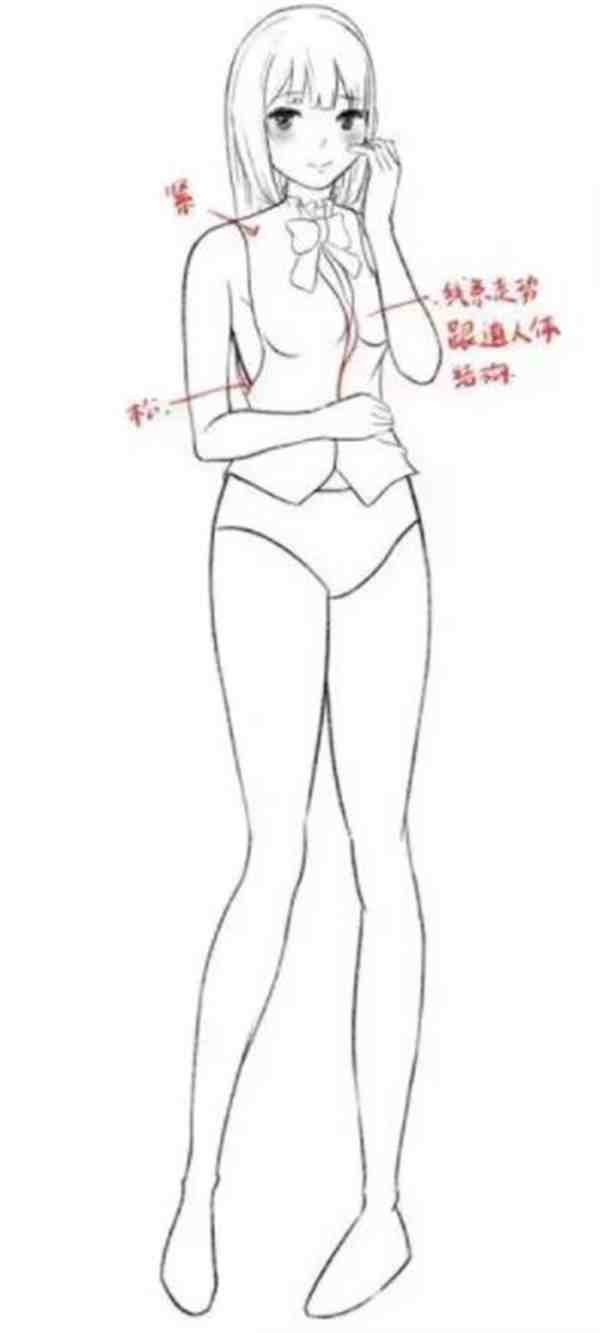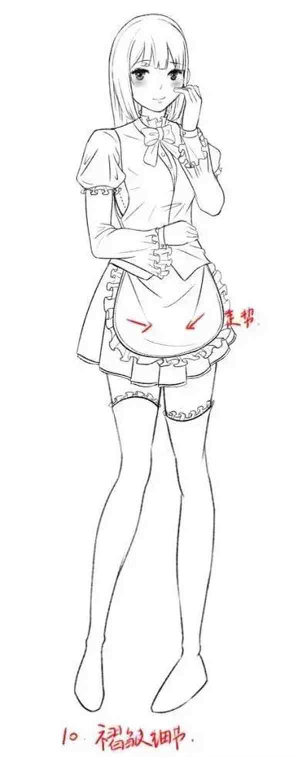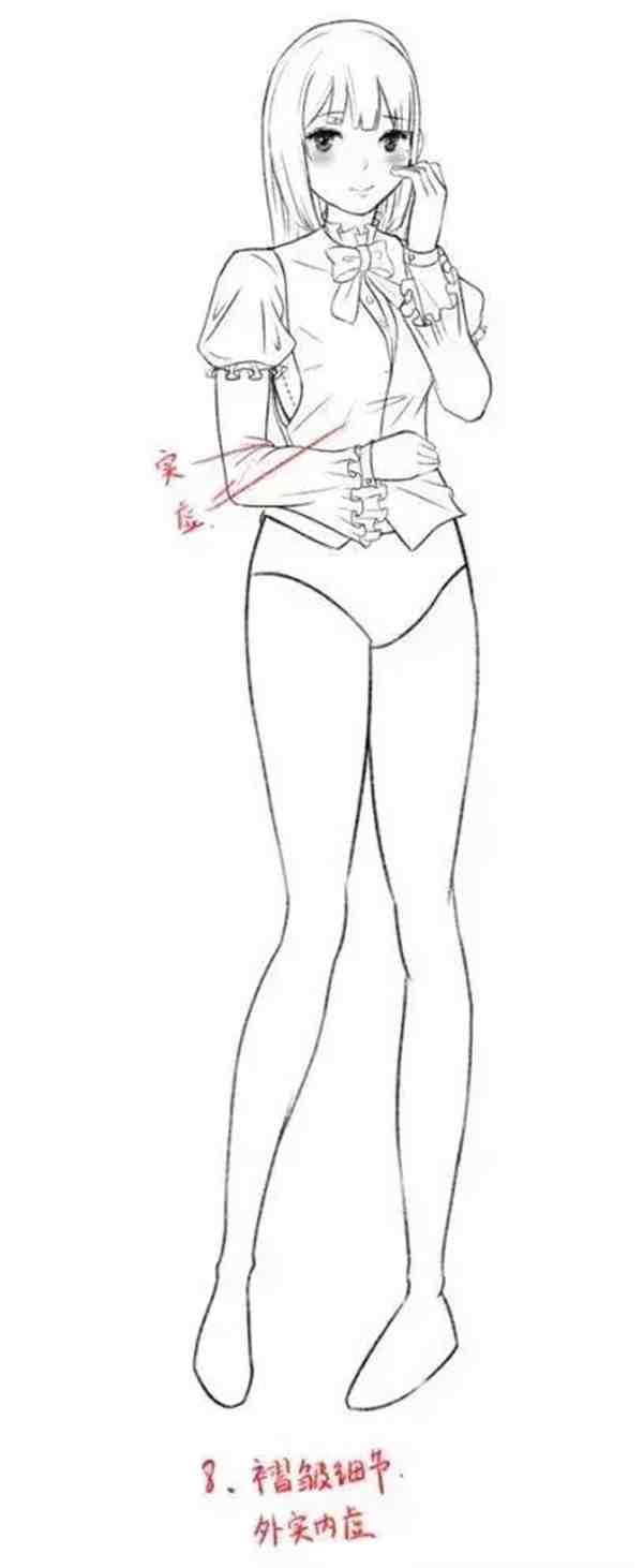 添加褶皱细节的时候,讲究的是外实内虚,拿年轮做比喻,越靠近边缘越实,越靠近中间越虚。所以,衣服内部的褶皱线条画的虚一点,手臂弯曲挤压的线条画的实一点。