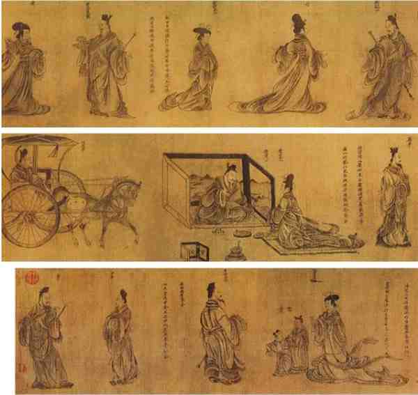 2、《女史箴图》:这幅画也是顾恺之的杰作,原作已佚,现存的是唐代摹本,主要有两个绢本,一为故宫博物院藏,一为英国大英博物馆藏。此画根据西晋张华《女史箴》一文而作,旨在劝诫宫廷妇女应遵守的道德礼教。