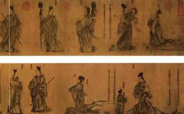 8、《列女仁智图》:此卷人物动态、面相特点与《女史箴图》卷十分接近。但其人物形体尺度略显规范,用笔较多;行笔风格是稍微显得圆且头尾大小十分均匀的“铁线描”,画中墨色晕染痕迹重,略带制作痕迹。