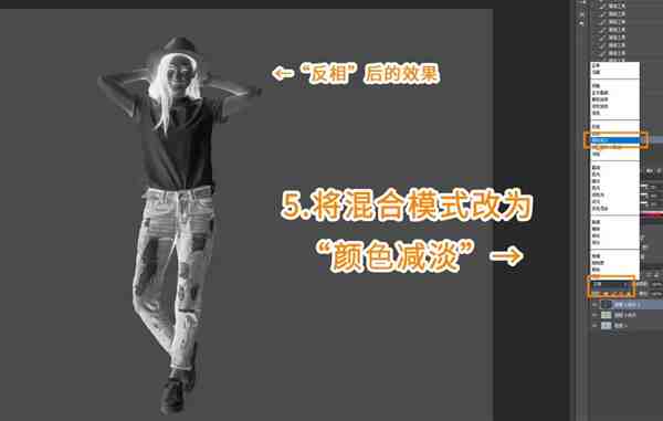 图片反相:照片去色后呈现黑白状态,此时再次复制图层—点击“图像”—选择“调整”—选择“反相”,反相后相片呈现“底片”效果,此时将图层混合模式改为“颜色减淡”。
