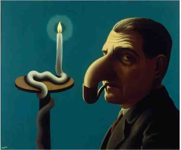 雷内·玛格丽特(1898.11.21-1967),超现实作品主要描写潜意识领域的矛盾现象,把生与死、过去与未来、真实与幻觉统一起来,具有恐怖、离奇、怪诞的特点。