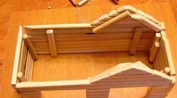 3.如图所示,利用胶水将一次性筷子粘贴可爱仓鼠笼子的围墙和房梁,注意留下门的宽度(这一点要根据仓鼠身体尺寸来决定),如图所示。