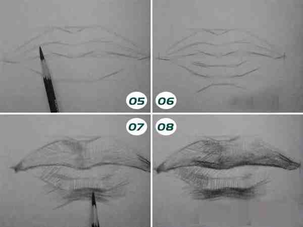 素描嘴巴的画法步骤05、06、07、08:上下口唇分别是两个相对的W型,上口唇比较长,唇线比较分明,突出于下口唇,中央有一个上唇结节唇线将上口唇一分为二。人中位于上唇结节线的上部,是鼻子与嘴之间的凹槽。这一部分的结构由凹到凸,使它的对比变化较为突出。下口唇的变化比较圆滑,分别由左右两个唇结节形成两个微突点。