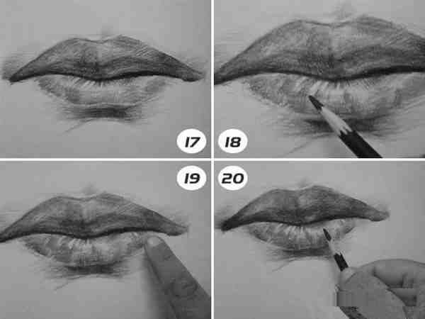 素描嘴巴的画法步骤17、18、19、20:嘴的结构与周围脸部的肌肉联系很密切,嘴的运动会带来一系列面部的变化。唇本身呈现红色,与其他部分有一定色差,训练中要注意这些明暗上的变化。