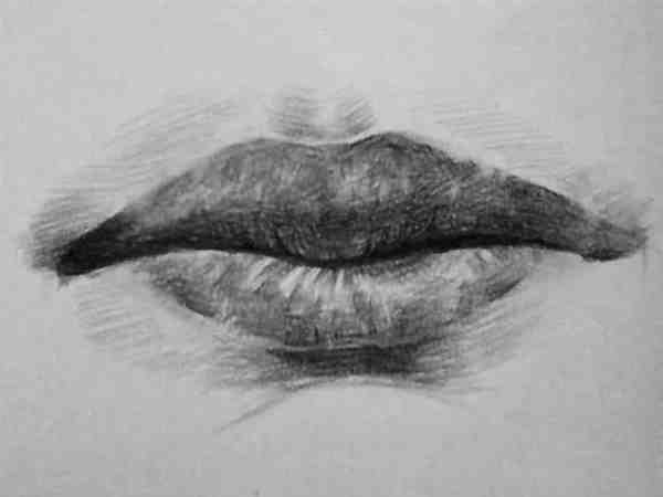 素描嘴巴的画法之最后完成图:因为嘴部在横向上是一个半圆柱体的感觉,所以在表现时要尽量画出中间嘴唇实、两侧嘴角虚的感觉。同时, 从表现手法上来讲, 嘴部的中间部位可以用一些相对较清晰的线条顺着形体的方向排线, 然后将嘴角部分的线条揉虚。