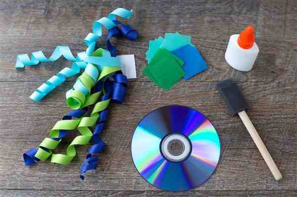 步骤2.制作章鱼身体:将光盘清洗干净,用剪刀将光盘边缘剪成波浪形,模仿章鱼的触手。然后在光盘中心位置涂抹胶水,将彩色丝带粘贴在中心,作为章鱼的触须。