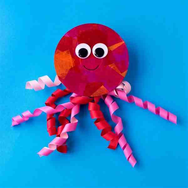 步骤4.装饰和固定:用彩色卡纸剪出一些小形状,如圆点、星星等,粘贴在章鱼的身体上作为装饰。最后,用细绳或橡皮筋将章鱼的身体固定在一起,使其保持立体形状。
