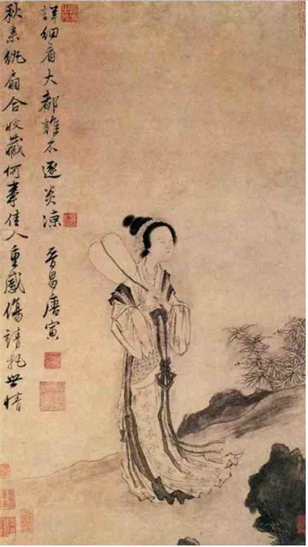 《秋风纨扇图》是明代画家唐寅最有名的纸本水墨画之一,在张大镛《自怡悦斋书画录》、庞元济《虚斋名画录》等皆有著录,现藏于上海博物馆。画中描绘了立有湖石的庭院,一仕女手执纨扇,侧身凝望,眉宇间微露幽怨怅惘神色。此画为唐寅绘画的代表作,不仅仅人物形态刻画得十分准确,线条如飞,墨色如韵,还把画家本人的心情展现得含蓄而丰富,直接而妥贴。