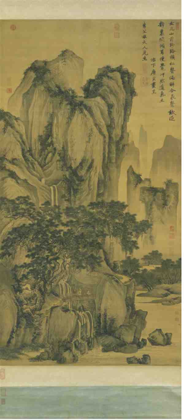 《山路松声图》是唐伯虎非常有名的一幅山水画,曾经清内府、梁清标收藏,《石渠宝笈三编》著录,现收藏于台北故宫博物院。此图绘层岩邃壑,飞瀑流泉;山腰苍松葱郁,虬枝老干,掩映画面;山下平湖一湾,清澈见底;一条崎岖不平的野路,蜿蜒通向山间,以增加画面的幽深感;一隐者凭眺倚栏,静听松风,侍者囊琴随后,表达了作者向往与世无争、闲淡自然生活的理想。