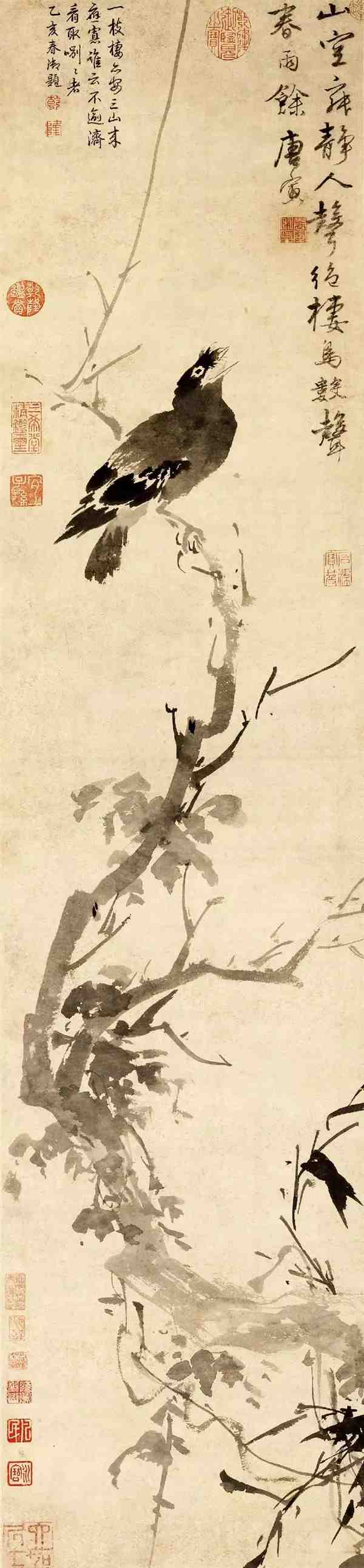 《古槎鸜鹆图》是唐寅水墨花鸟画的代表作之一,又名《春雨鸣禽图》,画中以大笔没骨涂染,塑造了一只栖息枝头、昂首鸣春的鹤鹆的优美形象。树枝劲挺多姿,枝端线条异长,似有微微颤动,枝上有盘藤环绕,旁有新竹丛生,画面充满无限生机与活力。画作右上方有画家自题的对句诗“山空寂静人声绝,栖乌数声春雨余”,可谓诗画共鸣。