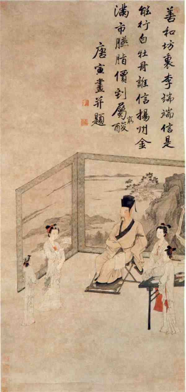 《李端端图》是唐寅仕女画的代表作,描绘了唐代扬州名妓李端端与诗人崔涯之间的逸闻趣事,现藏于南京博物院。画中女子发簪高尚挽起,表情凝眸静思,素妆典雅明丽,风姿亭亭玉立;裙带在微风之中轻轻飘动,姿容秀芙,栩栩如生。该画用笔工致,用墨清润,设色雅丽,为一幅人物、山水俱佳之作。