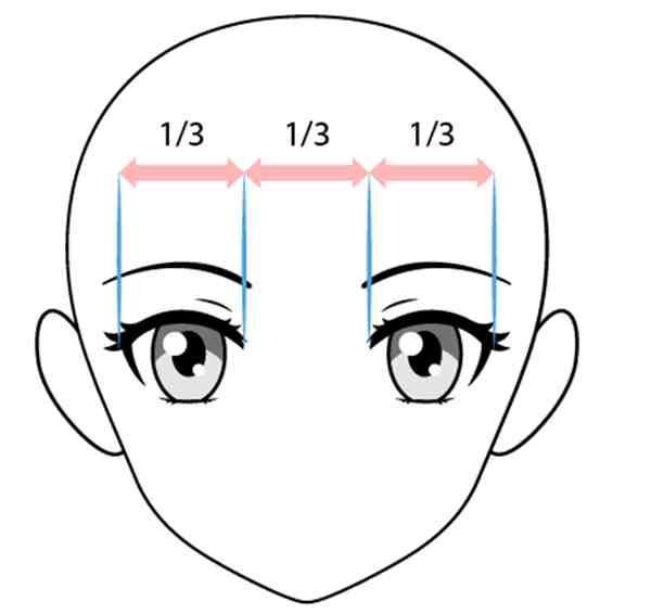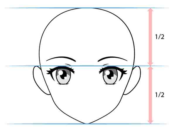 请注意,真实的眼睛通常直接位于这条线上,但在动漫中,眼睛往往会画在头部下方。对于年轻的女性角色尤其如此。