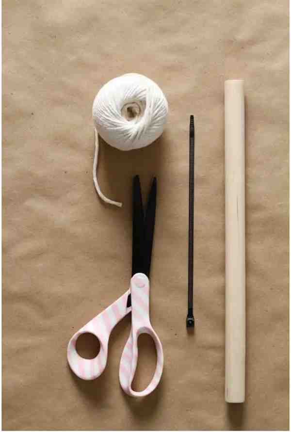 材料:棉线、木棒、2个塑料绑扎带、剪刀。