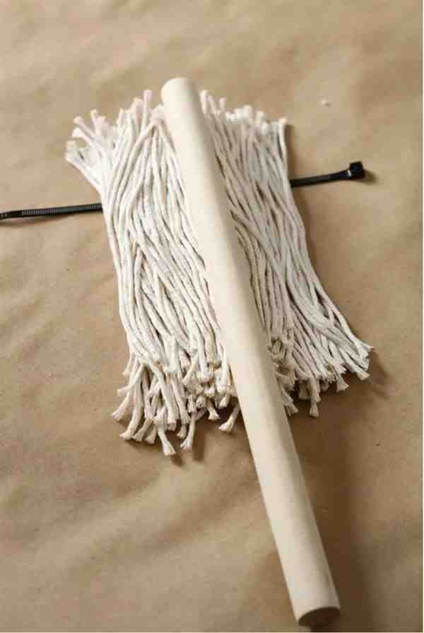 Step 5.将扎带收紧一点,然后将棉线整理一些,使棉线包裹木棒。再使劲拉紧扎带。剪断多余的扎带。