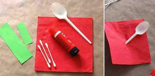 准备材料:塑料勺子、胶棒、棉棒、彩色面巾纸、卡纸