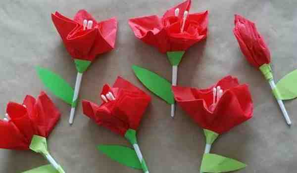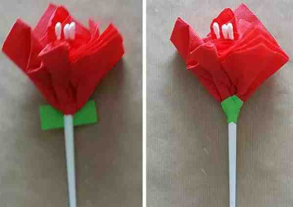 ④用绿色长条面巾纸在花朵底部固定住作为花蒂部分