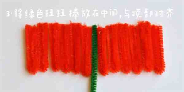3、添加绿色扭扭棒在排列好的红色扭扭棒中间放上一根绿色的扭扭棒,使其与红色扭扭棒顶部对齐。