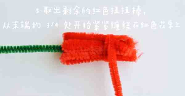 5、开始塑造花瓣取出剩余的红色扭扭棒,从其末端约314处开始紧紧缠绕在已经捆绑好的花束上。