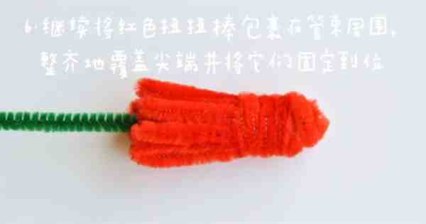 6、继续包裹继续将红色扭扭棒紧密地包裹在花束周围,确保尖端被整齐地覆盖并固定好。