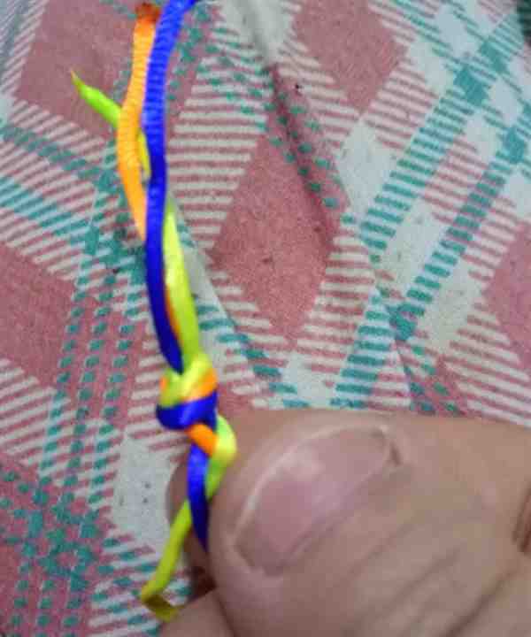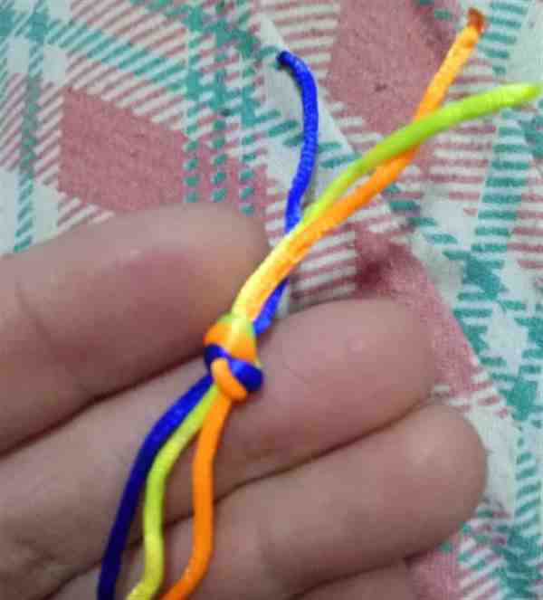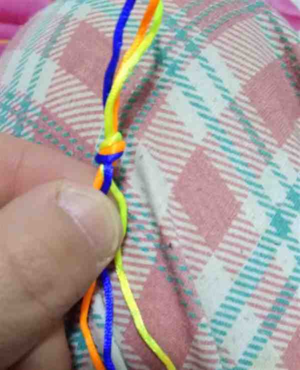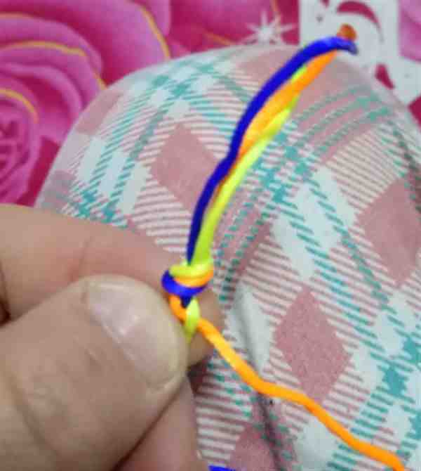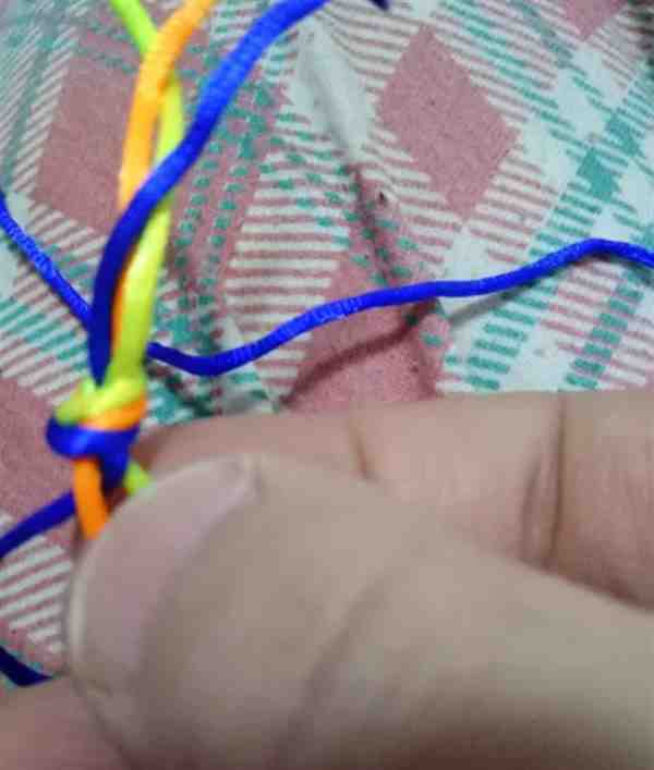 5、之后,再将黄色的绳子从下方穿过桔色和蓝色的绳子,置于最上方,这样黄色的绳子现在又在最上面了。
